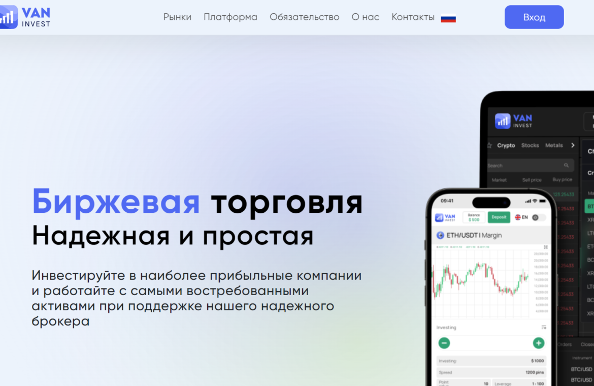 Сайт Van Investment обещает пользователям доступ к торговле разнообразными активами, включая криптовалюты, фондовые индексы, сырьё и валютные пары. Однако отсутствие прозрачной информации о лицензиях и регистрационных данных вызывает серьёзные сомнения. Это типично для мошеннических платформ, которые стремятся привлечь клиентов ложными обещаниями и красивым дизайном.