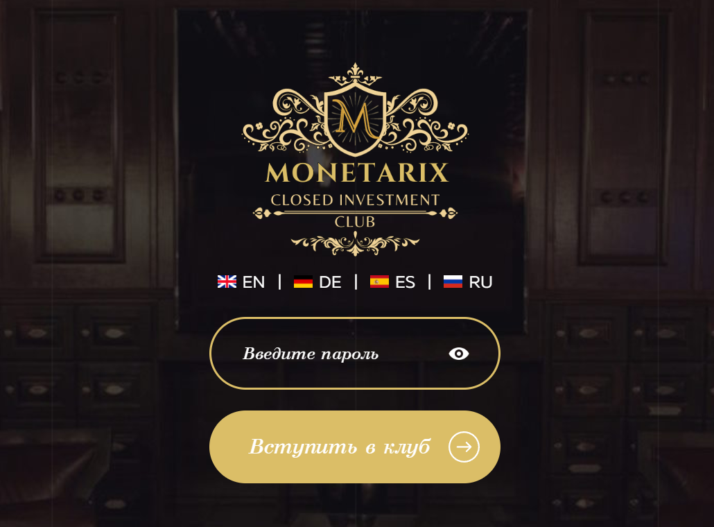 Monetarix позиционирует себя как эксклюзивная платформа для торговли и инвестиций, предлагающая доступ к финансовым рынкам через «клубную» систему. Войти на сайт можно только по паролю, что уже вызывает подозрения, так как подобные практики часто используются мошенниками для создания иллюзии эксклюзивности и надежности. Однако закрытые системы и отсутствие прозрачной информации о деятельности брокера настораживают, особенно когда дело касается вложений.