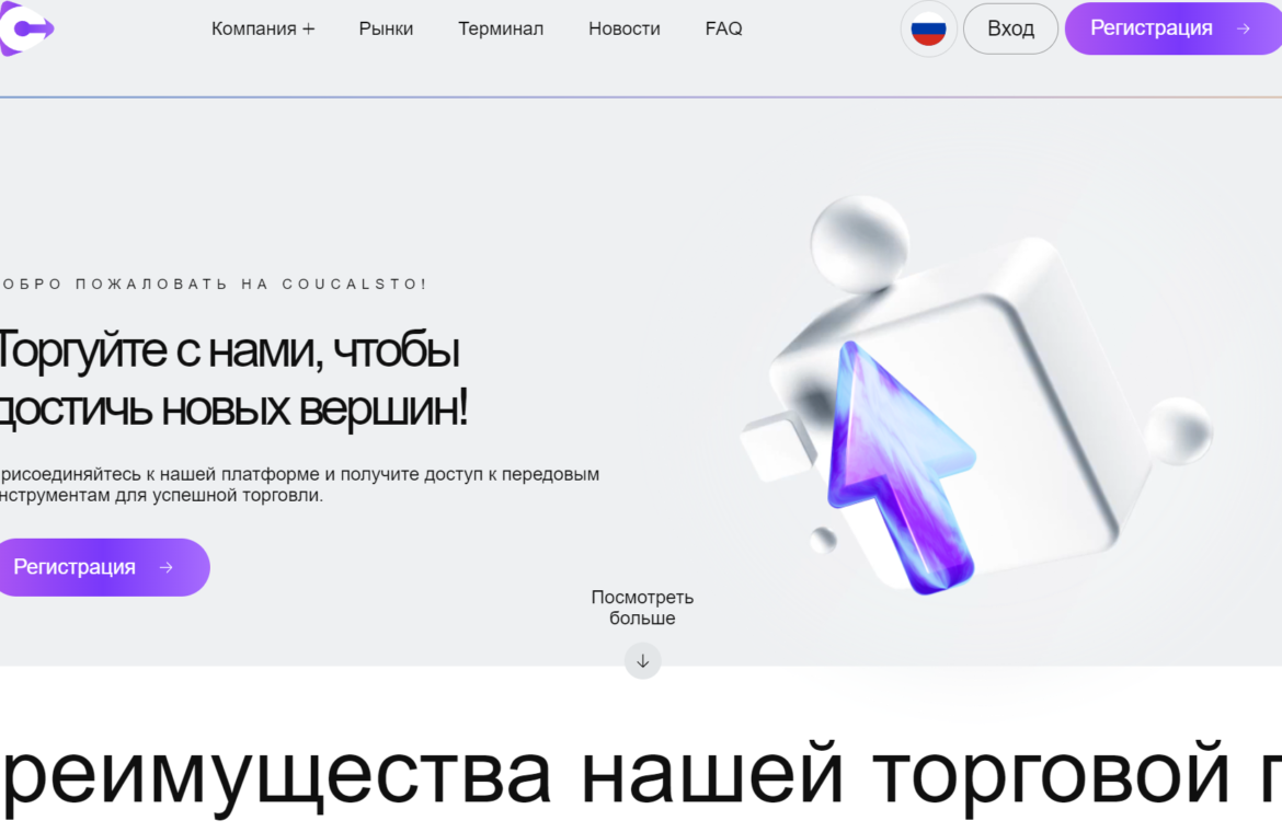 Coucalsto позиционирует себя как передовая платформа для торговли с обещанием «достижения новых вершин» на финансовых рынках. Сайт оформлен в минималистичном стиле с преобладанием светлых цветов и фиолетовых акцентов. На главной странице крупные заголовки и абстрактные графические элементы создают ощущение простоты и безопасности. Однако за привлекательным дизайном скрываются признаки типичной мошеннической платформы, которая обещает многое, но не предоставляет никаких гарантий.