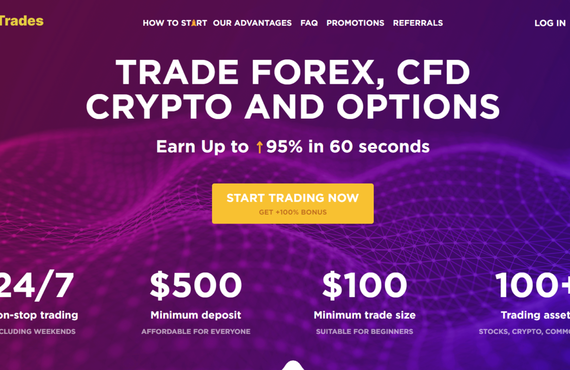 Сайт Xpert Trades оформлен с целью быстрого привлечения пользователей и обещает лёгкую регистрацию и «мгновенные выводы». Однако по структуре он больше напоминает шаблонную платформу без конкретики. На главной странице вы увидите такие лозунги, как «Earn up to 95% in 60 seconds» и «Get +100% bonus», что уже вызывает подозрения.