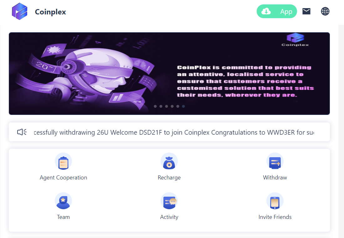 Coinplex выглядит как типичный пример сомнительной платформы, которая пытается завлечь пользователей громкими лозунгами о выгодах и успехах. На главной странице постоянно мелькают уведомления о «успешных выводах», такие как «Поздравляем SD23DD с успешным выводом 2U» или «Поздравляем QW34RF с успешным выводом 58U», что выглядит как стандартная уловка для создания видимости активности. Этот поток ненастоящих уведомлений направлен на то, чтобы убедить новых пользователей в безопасности и успешности платформы.