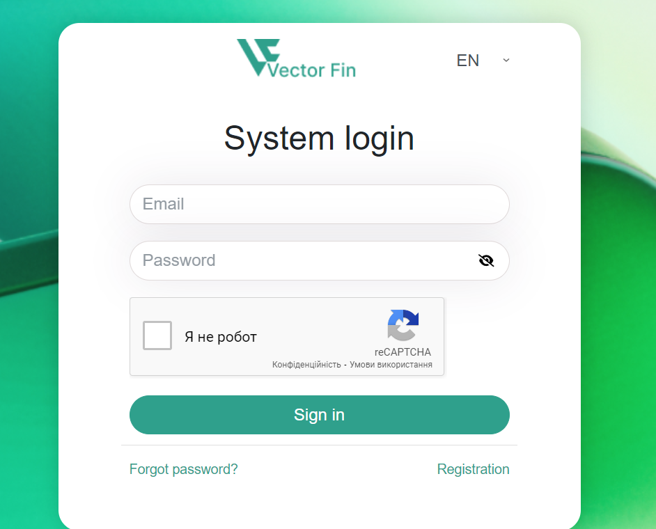 Vector-Fin — ещё один сомнительный проект, использующий шаблонный подход с минималистичным интерфейсом. Платформа предлагает только форму входа и регистрации, не раскрывая никакой информации о своих услугах, условиях торговли или юридической базе. Всё, что видит пользователь, — это логотип, поля для ввода данных и стандартная reCAPTCHA. Такой ограниченный функционал часто встречается на сайтах, созданных мошенниками, что вызывает обоснованные подозрения.